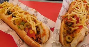 Premier jour, Santiago, on a 18 heures de voyage derrière nous et la dalle ! On s’arrête au centre ville en se disant qu’on va bouffer des fruits et du pain, en matant quand même le menu du snack devant nous. Et là bim, on découvre le « completo vegetariano ».